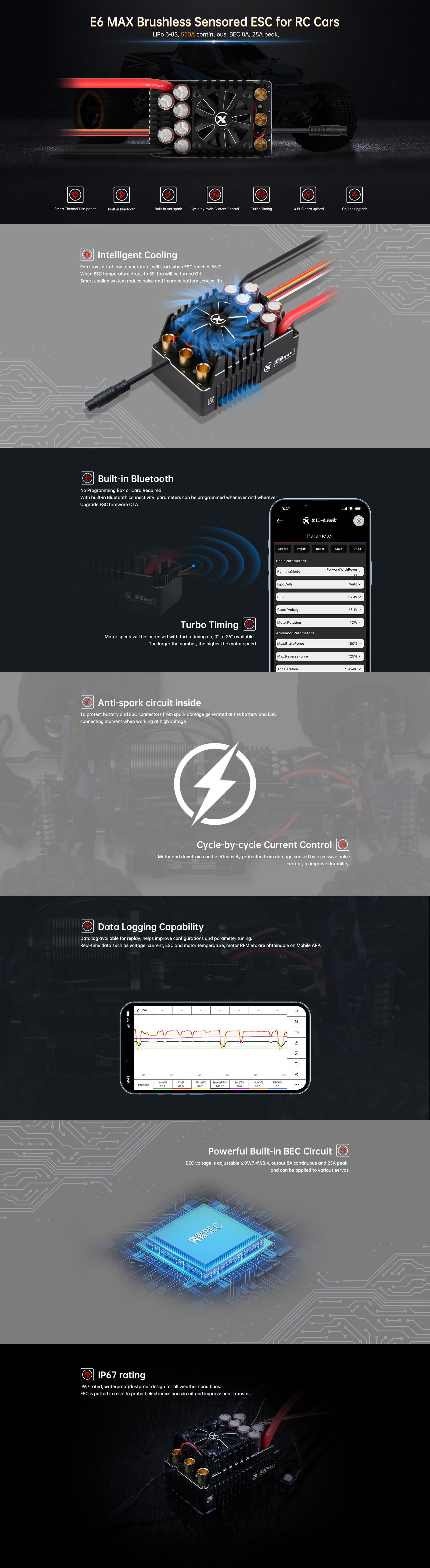 - High Power setup: XC E6Max ESC is compatible with 3-8S LiPo, delivering 550A continuous.